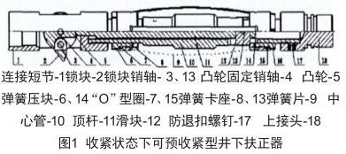 可預(yù)收緊型井下扶正器分別連接在電磁流量計的上端與下端,構(gòu)成上下扶正器,下井前用手或?qū)S檬站o工具,橫向上壓縮固定在彈簧卡座總成上4組彈簧片,在外力作用下簧片徑向收縮,在收縮過程中帶動彈簧卡座徑向位移,撥動滑塊,頂桿向上徑向位移,同時轉(zhuǎn)動凸輪,當凸輪邊緣上的球面凹坑與頂桿成水平線時松開頂桿,頂桿下端圓球面與凸輪上的球面凹坑偶合,松開4組彈簧片,此時彈簧片處于收緊狀態(tài),將儀器裝入防噴管內(nèi),打開測試閘門儀器即可下井,如圖1所示。