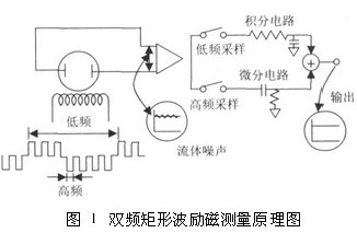 雙頻矩形波勵磁測量原理如圖1所示,一個由高低頻分量迭加而成的電磁場通過勵磁線圈被施加到被測液體中,勵磁波形是在一個低頻矩形波上迭加一個高于市電頻率的矩形波而得到的波形。在產(chǎn)生的電動勢中,低頻分量通過一個大時間常數(shù)的積分電路獲得一個零點穩(wěn)定性好的平穩(wěn)流量信號。而由漿液或低電導率流體產(chǎn)生的低頻噪聲可被不受噪聲影響的高頻采樣電路所抑制,有著同樣時間常數(shù)的流量信號經(jīng)過一個差分電路以確定流速信號的變化,把這兩種不同頻率采樣所得的信號結(jié)合起來可獲得一個穩(wěn)定流速信號,該信號不受噪聲干擾,且有較高的零點穩(wěn)定性。