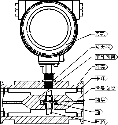 圖所示為渦輪流量傳感器結(jié)構(gòu)簡圖,由圖可見,當被測流體流過傳感器時,在流體作用下,葉輪受力旋轉(zhuǎn),其轉(zhuǎn)速與管道平均流速成正比,葉輪的轉(zhuǎn)動周期地改變磁電轉(zhuǎn)換器的磁阻值。檢測線圈中的磁通隨之發(fā)生周期性變化,產(chǎn)生周期性的感應(yīng)電勢,即電脈沖信號,經(jīng)放大器放大后,送至顯示儀表顯示。
