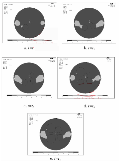 筆者探討在一體式電磁流量計(jì)徑向截面位置開始出現(xiàn)油氣泡時(shí)一體式電磁流量計(jì)感應(yīng)信號(hào)的響應(yīng)情況。在仿真模型中,設(shè)定這樣一個(gè)過程,在連續(xù)時(shí)刻 t 1 、t 2 、t 3 、t 4 ,流量計(jì)電*位置的徑向截面上分別開始出現(xiàn)一個(gè)油氣泡(非導(dǎo)電物質(zhì)),在 t 5 時(shí)刻出現(xiàn)的4 個(gè)油氣泡的半徑變大。在這一過程中,研究非導(dǎo)電物質(zhì)(油氣泡)的增加與變化對(duì)流量計(jì)輸出信號(hào)的影響情況;這一過程中,流體中的含水率也在變化,同時(shí)研究含水率對(duì)流量計(jì)的影響情況。圖 1 所示為流量計(jì)截面中油氣泡(非導(dǎo)電物質(zhì))增加與變化時(shí)的 Ansys 仿真圖,圖 1a ~ e 中分別顯示的是 t 1 ~ t 5 時(shí)刻虛電流 x 方向分量的 An-sys 圖。