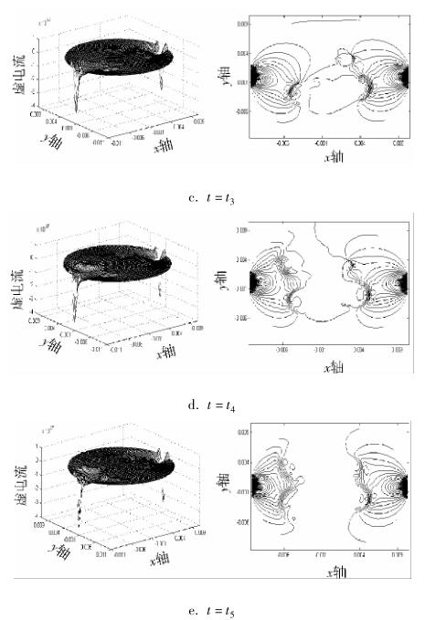 對(duì) Ansys 仿真實(shí)驗(yàn)數(shù)據(jù)通過 Matlab 進(jìn)行結(jié)果分析。圖 2a ~ e 分別為 t 1 ~ t 5 時(shí)刻流體中存在油氣泡流量計(jì)測(cè)量區(qū)域虛電流在 x 方向上的分布圖及其等勢(shì)圖。從圖中可以看出:當(dāng)流體中油氣泡增加時(shí),流量計(jì)測(cè)量區(qū)域的敏感場(chǎng)發(fā)生變化,且流體中油氣泡越多,對(duì)流量計(jì)測(cè)量區(qū)域敏感場(chǎng)影響越大。為了更客觀地反應(yīng)這種現(xiàn)象,下面運(yùn)用敏感場(chǎng)靈敏度 c 進(jìn)一步進(jìn)行研究。