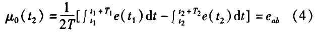 分體型電磁流量計一般都采用工頻交流電源供電,其電源電壓的幅值和頻率的變化都會給分體型電磁流量計帶來電源性干擾噪聲。對電源電壓的幅值變化,因采用多級集成穩(wěn)壓,一般而言電源電壓的幅值變化對電磁流量的測量精度影響不大。當(dāng)電源電壓的頻率波動時,雖然其波動范圍有限,但對分體型電磁流量計測量精度影響較大。為了解決工頻干擾問題,實現(xiàn)對流體流速感應(yīng)電勢e柚信號的準(zhǔn)確測量,需利用以下基本關(guān)系:①勵磁周期為工頻周期的整數(shù)倍,即勵磁頻率為50/nHz(n為偶數(shù));②正負(fù)勵磁下的同相位采樣。圖2是對應(yīng)低頻矩形波勵磁形式下的典型電勢信號形式,按上述關(guān)系在一個勵磁周期下,若假設(shè)t。和t:點為工頻干擾的等效干擾點,且采樣寬度T=T1=T2,則e –ab的基本算式為:,