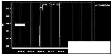 本應(yīng)用中的灌裝控制閥有兩級行程,在從小流量變換為大流量時,閥桿的二次動作使管道內(nèi)的流速顯著減小,增大了測量誤差(圖9)。灌裝控制閥的結(jié)構(gòu)和工作方式,影響了管道中的液體流速,是誤差的主要形成因素來源。但試驗證明,可以通過調(diào)整閥桿的行程來改善。