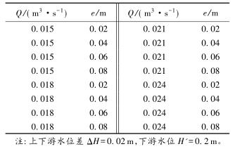 有限水域的浮體結(jié)構(gòu)在不同來流動(dòng)水中運(yùn)行時(shí),浮體結(jié)構(gòu)位置的改變會(huì)對(duì)流場產(chǎn)生影響,從而影響浮體結(jié)構(gòu)的泄流能力以及穩(wěn)定性。試驗(yàn)過程中固定浮體結(jié)構(gòu)的體型不變(長L=0.20m,寬B=0.30m,高a=0.10m),分別選取4種不同來流流量Q及浮體結(jié)構(gòu)位置e,控制浮體結(jié)構(gòu)在上、下游水位不變的條件下進(jìn)行試驗(yàn),具體試驗(yàn)參數(shù)設(shè)計(jì)及說明見表1以及圖2。