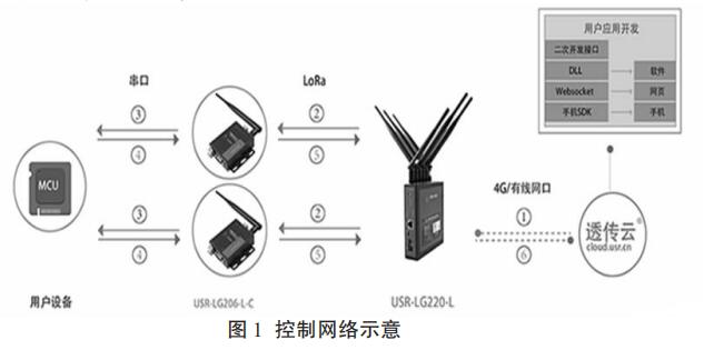 基于 LoRa 技術的無線流量計由控制,計量,通信,電源,存儲五個模塊組成。以空調水流量計為主體的計量模塊將采集到的供暖管道數(shù)據(jù)發(fā)送到通信模塊,基于 LoRa 技術的通信模塊將流量數(shù)據(jù)存儲并且發(fā)送到由管理人員監(jiān)控的控制模塊,管理人員通過控制模塊和通信模塊向流量計發(fā)送指示。電源模塊是無線流量計的能源中心,可以為流量計的其他模塊提供動力支持。流量計安裝完畢后可在小區(qū)內形成控制網絡,網絡示意圖如圖 1 所示。