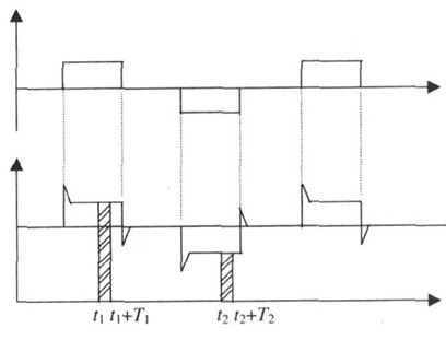 果汁流量計(jì)一般都采用工頻交流電源供電, 其電源電壓的幅值和頻率的變化都會(huì)給果汁流量計(jì)帶來電源性干擾噪聲。對(duì)電源電壓的幅值變化, 因采用多級(jí)集成穩(wěn)壓, 一般而言電源電壓的幅值變化對(duì)電磁流量的測(cè)量精度影響不大。當(dāng)電源電壓的頻率波動(dòng)時(shí), 雖然其波動(dòng)范圍有限, 但對(duì)果汁流量計(jì)測(cè)量精度影響較大。為了解決工頻干擾問題, 實(shí)現(xiàn)對(duì)流體流速感應(yīng)電勢(shì)eab信號(hào)的準(zhǔn)確測(cè)量, 需利用以下基本關(guān)系:①勵(lì)磁周期為工頻周期的整數(shù)倍, 即勵(lì)磁頻率為50/nHz(n為偶數(shù));②正負(fù)勵(lì)磁下的同相位采樣。圖2是對(duì)應(yīng)低頻矩形波勵(lì)磁形式下的典型電勢(shì)信號(hào)形式, 按上述關(guān)系在一個(gè)勵(lì)磁周期下, 若假設(shè)t1 和t2 點(diǎn)為工頻干擾的等效干擾點(diǎn), 且采樣寬度T=T1 =T2 , 則eab的基本算式為: