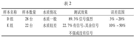 當(dāng)然除了管徑這一大因素外,污水水質(zhì)的好壞也是一個影響檢測效果的原因。把受檢的 50 臺流量計所流過的水質(zhì)分為兩組,水質(zhì)一般 D 組和水質(zhì)較差 E 組。整理數(shù)據(jù)見表 2。
