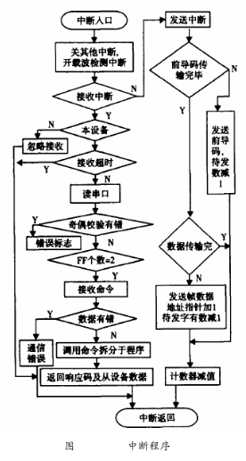 在HART通信中,玻璃水流量計作為從設(shè)備進(jìn)行通訊,所以這里的軟件設(shè)計只是針對于從設(shè)備。HART通信采用水平和垂直校驗的方法。當(dāng)檢測到接收數(shù)據(jù)有差錯時,則等到主設(shè)備命令幀發(fā)完后,通知主設(shè)備數(shù)據(jù)接收有誤。主設(shè)備則重新發(fā)命令幀,從而保證通信的準(zhǔn)確可靠。HART中斷子程序流程圖如圖6所示。由于HART通信為主從方式,HART幀中每個字節(jié)在物理層傳輸需要9ms左右,為了保證通訊的實時性,通訊程序采用串行口終端接收/發(fā)送。該中斷所要完成通信中的主要任務(wù),即接收和發(fā)送幀,幀的拆分和打包。