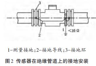 傳感器安裝在塑料管道或內(nèi)壁有絕緣涂層、襯里的管道上,兩端應安裝接地環(huán)(或帶有接地電*的金屬短管),然后用導線連接,使管內(nèi)流動的介質(zhì)與大地短路,具有零電位(見圖2)。