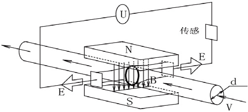 如圖,測量流量時,流體流過垂直于流動方向的磁場,導電性流體的流動感應出一個與平均流速成正比的電勢。其感應電壓信號通過兩個電*檢出,并通過電纜傳送至轉(zhuǎn)換器,經(jīng)過信號處理及相關(guān)運算后,將累計流量和瞬時流量顯示在轉(zhuǎn)換器的顯示屏上。