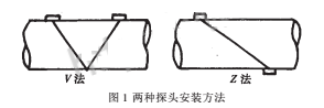 目前的流量計(jì)的基本測量原理和方法有以下三種:①時(shí)間差法,②相位差法,③頻率差法?,F(xiàn)在國內(nèi)外的大多數(shù)非接觸式超聲流量計(jì)使用的都是頻差法。例如富士株士會(huì)社生產(chǎn)的FLB-1型超聲流量計(jì)使用的就是這種方法。它提供了可供選擇的兩種探頭安裝方法。如圖1所示。其中V法適用于小管徑的管道,而Z法則適用于2000mm或更大管徑的管道。另外,當(dāng)無法提供合適的安裝間距時(shí),宜于采用Z法,因?yàn)閆法僅需V法間距的一半,同時(shí),在流體速度很高時(shí),也應(yīng)選擇Z法。當(dāng)管內(nèi)壁的污垢很厚時(shí),也不適用反射式的V法而選用Z法。但不論采用哪種方法,都很難排除隨機(jī)的噪聲干擾,造成較大的誤差。因此,我們設(shè)計(jì)了一種新型的相關(guān)式超聲流量計(jì)。