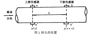 相關(guān)檢測技術(shù)在國內(nèi)外文獻(xiàn)中研究得很多,但在自來水流量測量中付諸實(shí)現(xiàn)仍是難的課題,本文所采用的相關(guān)檢測方法如圖2所示。在管道上裝有兩組傳感器,上游傳感器和下游傳感器,兩組傳感器之間距離L。相關(guān)檢測的實(shí)質(zhì)是測出流體通過線性系統(tǒng)時(shí),走過L長的距離所需的時(shí)間T。