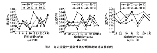 將實驗測得的水泥計量表在不同溫度及流速下的重復(fù)性數(shù)據(jù)整理,特性曲線如圖2所示,3組曲線分別對應(yīng)DN40, DN80, DN100的3塊水泥計量表的重復(fù)性曲線。
