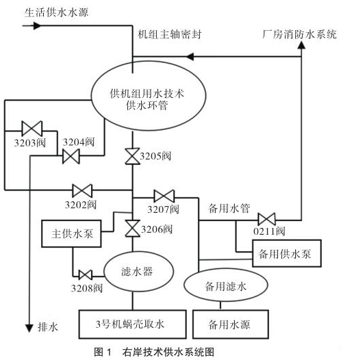 大化電廠技術(shù)供水包括右岸和左岸供水,本文以右岸 3 號(hào)機(jī)技術(shù)供水系統(tǒng)增設(shè)帶現(xiàn)場(chǎng)顯示二次供水流量計(jì)技術(shù)改造方案為例進(jìn)行分析說(shuō)明。右岸技術(shù)供水系統(tǒng)(見(jiàn)圖 1)由各機(jī)組單元蝸殼取水主水源、濾水器、主供水泵、正反向切換閥(3202 閥與 3204 閥開(kāi)為反向取水,3203 閥與 3205閥開(kāi)為正向取水,運(yùn)行時(shí)只開(kāi)其中一種)、備用水源、備用濾水器、備用供水泵和備用總水管構(gòu)成一個(gè)整體,并通過(guò) 0211 閥與廠房消防水系統(tǒng)相連接,可通過(guò)主水源自流供水、主水源水泵增壓供水、備用水源自流供水、備用水源水泵增壓供水等不同供水方式向機(jī)組推力軸承冷卻器和發(fā)導(dǎo)軸承冷卻器、水導(dǎo)軸承冷卻器、發(fā)電機(jī)空氣冷卻器提供冷卻水源。機(jī)組技術(shù)供水正常運(yùn)行采用單元蝸殼取水的供水方式運(yùn)行,以備用水源供水為輔。機(jī)組主軸密封用水分別取自生活供水水源和技術(shù)供水備用總管水源,向機(jī)組大軸提供可調(diào)水壓端面密封水源。在現(xiàn)場(chǎng)配置一個(gè)技術(shù)供水現(xiàn)地單元柜,實(shí)現(xiàn)對(duì)機(jī)組技術(shù)供水系統(tǒng)設(shè)備自動(dòng)控制、故障保護(hù)及報(bào)警。柜內(nèi)配置可編程 PLC 控制系統(tǒng),電控柜對(duì)主供增壓泵、3202 至 3208 電動(dòng)碟閥進(jìn)行流程控制。