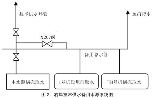 技術(shù)供水系統(tǒng)設(shè)有主、備用水源。主水源是蝸殼取水,作為機(jī)組技術(shù)供水的主用水源。備用水源有兩個(gè),一個(gè)是設(shè)在 1 號(hào)機(jī)段的壩前取水,取水口高程為 145m,另一個(gè)是同 4 號(hào)機(jī)組蝸殼取水共用取水口的蝸殼備用取水。兩路備用水源均接到備用總水管,并通過(guò) X207 閥分別與各臺(tái)機(jī)組的技術(shù)供水系統(tǒng)相連通(見(jiàn)圖 2)。