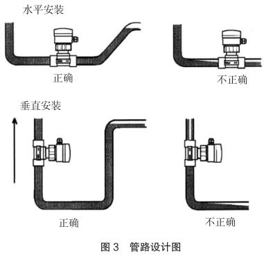 現(xiàn)場(chǎng)安裝時(shí)應(yīng)注意遠(yuǎn)離可能對(duì)其產(chǎn)生干擾的大型設(shè)備,防止長(zhǎng)期的熱輻射和其他如磁場(chǎng)直射等環(huán)境影響。為確保高測(cè)量精度和較好的零點(diǎn)穩(wěn)定性,進(jìn)行校正前,二次供水流量計(jì)應(yīng)裝入工藝介質(zhì)中至少 24 小時(shí)電*鈍化。安裝的管路設(shè)計(jì)應(yīng)確保管道始終充滿(mǎn)流體,防止測(cè)量誤差,管路設(shè)計(jì)圖見(jiàn)圖 3。