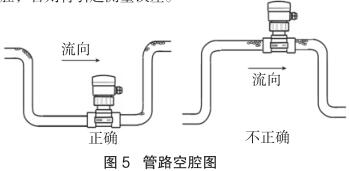 測(cè)量流向取決于二次供水流量計(jì)的安裝方位,將二次供水流量計(jì)在接頭上旋轉(zhuǎn) 180 度即可反向。正流向時(shí),二次供水流量計(jì)的突耳應(yīng)在上游方向。流量顯示總是正的,而累加器可以根據(jù)流向增加或者減少。安裝中確認(rèn)管路設(shè)計(jì)不允許在介質(zhì)中產(chǎn)生氣泡或空腔,否則將引起測(cè)量誤差(見(jiàn)圖 5)。