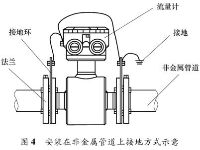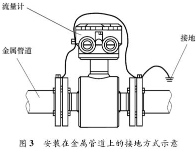 一體式污水流量表安裝在金屬管道上,安裝時(shí)將金屬管道與一體式污水流量表相連接,接地線再接入接地網(wǎng),如圖 3 所示。