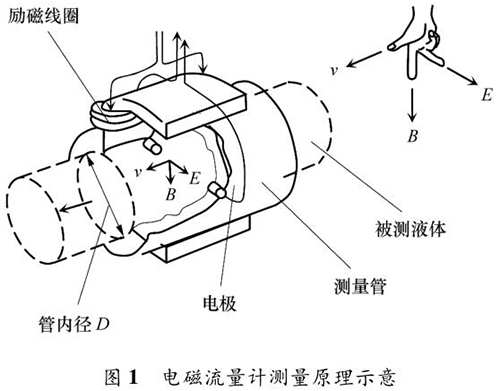 一體式污水流量表的測(cè)量原理如圖 1 所示。根據(jù)法拉*電磁感應(yīng)定律,導(dǎo)電液體在磁場(chǎng)中流動(dòng)會(huì)產(chǎn)生電動(dòng)勢(shì) E,它與磁感應(yīng)強(qiáng)度 B、導(dǎo)電液體平均流速 v 成一定比例關(guān)系: