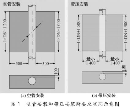 (1)要確認(rèn)在用冷凍鹽水流量計(jì)的管壁厚度及內(nèi)襯材料特性,保證換能器在管段內(nèi)壁的突出長度;(2)用氣焊切割冷凍鹽水流量計(jì)外殼時(shí),一定要在管道內(nèi)充滿水的情況下(*好是帶壓并繼續(xù)保持管內(nèi)水在運(yùn)行流動(dòng)的狀態(tài))進(jìn)行,以免內(nèi)襯受熱凸起變形影響流態(tài);(3)要有足夠安裝空間(流量井),可以用原有的流量井,但管壁與流量井墻壁*小距離不小于 500 mm,流量井長不小于 1. 5 倍管徑。超聲波流量計(jì)空管安裝和帶壓安裝要求空間如圖 1 所示。