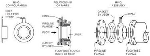 對(duì)于接地環(huán)應(yīng)用,如果使用傳統(tǒng)的孔板式或C型接地環(huán),則必須使用接地帶將接地環(huán)連接到流量管的主體/外殼。這些帶子連接到流量管的法蘭上,或接地線連接到位于其遠(yuǎn)程接線盒或頂部安裝的變送器接口板上的接線片上。E型接地環(huán)使用客戶提供的螺栓,而不是接地線或接地帶。