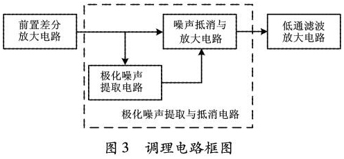 根據(jù)前饋控制的自適應(yīng)*化噪聲抵消原理,設(shè)計(jì)了信號(hào)調(diào)理電路2,以實(shí)現(xiàn)*化噪聲的濾除。信號(hào)調(diào)理電路2主要包括前置差分放大電路、*化噪聲提取與抵消電路、低通濾波放大電路三部分。調(diào)理電路如圖3所示。