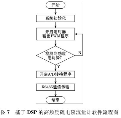 軟件流程圖如圖7 所示。軟件采用模塊化的設(shè)計(jì)方法,主要設(shè)計(jì)了勵(lì)磁控制切換程序、PWM 波產(chǎn)生程序、A/D 轉(zhuǎn)換程序以及 RS485 通信程序等。系統(tǒng)上電后*先執(zhí)行復(fù)位操作,利用 DSP 內(nèi)部的定時(shí)器產(chǎn)生PWM 波控制 H 橋電路中的勵(lì)磁方式,當(dāng)系統(tǒng)檢測到傳感器線圈輸出的感應(yīng)電動(dòng)勢后,利用 DSP 內(nèi)部的 12位 A/D 轉(zhuǎn)換器對(duì)此信號(hào)進(jìn)行模數(shù)轉(zhuǎn)換,*后根據(jù)相應(yīng)算法計(jì)算出管道中被測液體的流量。