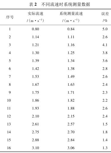 由表 2 測量數(shù)據(jù)可知,系統(tǒng)在測量低流速液體時(shí)(流速小于 1 m/s)誤差較大,達(dá)到 5%,當(dāng)待測液體的流速增大時(shí)(大于 1.4 m/s),誤差逐漸減小,基本維持在 3%以內(nèi)。由此可見系統(tǒng)具有較高的檢測精度,尤其是當(dāng)管道中的液體流速較高時(shí),系統(tǒng)的檢測誤差不超過 3%,達(dá)到了設(shè)計(jì)預(yù)期。