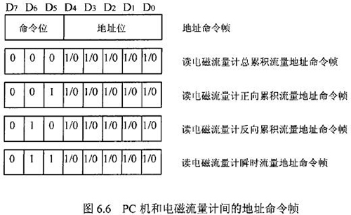 由于RS一485電氣標(biāo)準(zhǔn)規(guī)定每段只能聯(lián)結(jié)犯個節(jié)點設(shè)備,因此可用地址幀中五個二進(jìn)制位表示這32個地址,其余3位用來表示命令,從而構(gòu)成地址命令幀。對于控制命令需求不超過八個的通信系統(tǒng),采用地址命令幀可壓縮報文長度提高通信效率。在污水網(wǎng)絡(luò)監(jiān)控系統(tǒng)中,硫酸流量表和PC機通信的主要目的是將流量計中的有用數(shù)據(jù)讀到PC機中。這些數(shù)據(jù)包括:總累積流量、正向累積流量、反向累積流量、瞬時流量。通信時,PC機只需向硫酸流量表發(fā)送讀總累積流量、讀正向累積流量、讀反向累積流量、讀瞬時流量命令即可,因此二者間通信所用的地址幀和命令幀可合二為一,用一個地址命令幀代替。PC機和硫酸流量表間的地址命令幀定義如圖.66所示。根據(jù)污水網(wǎng)絡(luò)監(jiān)控系統(tǒng)中PC機與硫酸流量表間通信的特殊性,二者通信所使用的報文可簡化為圖.67的格式。