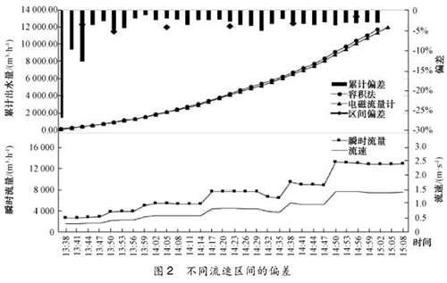 本次測量兼顧了不同的流速區(qū)間,在不同流速(0. 30、0. 42、0. 58、0. 84、0. 98、1. 40 m/s)區(qū)間的偏差分別是 -3. 65%、-5. 35%、-4. 24%、-3. 95%、-3. 35%、-1. 62%,如圖 2 所示。