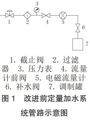 工廠的香料廚房系統(tǒng)為國內(nèi)煙機(jī)公司 2004 年設(shè)計制造,其定量加水系統(tǒng)主要由水源、智能法蘭式電磁流量計、加水管路元件和控制程序這四部分組成,改進(jìn)前管路示意圖如圖 1 所示。