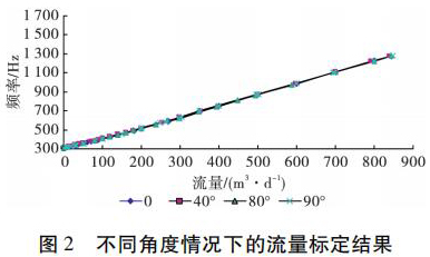 為了考察井眼斜度變化對進水流量計測量流量的影響,開展了非集流進水流量計在不同斜度情況下的流量測量模擬實驗。模擬實驗在大慶油田多相流實驗室進行,儀器外徑 38 mm,模擬井筒內(nèi)徑為 124 mm,實驗介質(zhì)是水,傾斜角度分別為 0°、40°、80°和 90°( 水平) ,流量范圍為 5 ~ 850 m3 /d。實驗結(jié)果表明,在儀器居中條件下,井眼斜度變化對進水流量計的儀表常數(shù)沒有影響,滿量程誤差不大于 4% ,因此可以應(yīng)用進水流量計進行水平井注水剖面測量。不同角度情況下的實驗結(jié)果如圖 2 所示。
