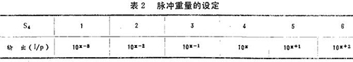 脈沖重量設(shè)定用S4插頭選擇進(jìn)行,它的設(shè)定有一定的條件,這些條件是脈沖輸出的類型、脈沖寬度和刻定常數(shù)。并且它的選擇范圍還要依據(jù)脈沖寬度和*大測量流量-口-口口-l0的X方(m3/h)來確定。其系數(shù)-(數(shù)字同*大流量m3/h)由*大流量的前三位有效數(shù)定決定,而對應(yīng)于“x”值的脈沖重量(l/p)見表2。