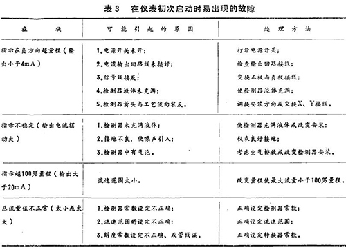 在儀表指示不正常時(shí),可根據(jù)下面介紹的一些典型故障和處理方法進(jìn)行必要的處理。這些故障可分為啟動(dòng)時(shí)易產(chǎn)生的故障,正常運(yùn)行時(shí)出現(xiàn)的故障和接地不良引起的故障(見表3、表4)。