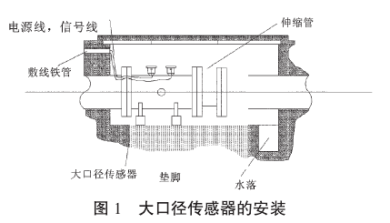 由于自來水行業(yè)的特點(diǎn),管網(wǎng)中運(yùn)行的大口徑傳感器基本安裝在井內(nèi),井內(nèi)容易積水或滲漏水,使傳感器接線盒內(nèi)受潮,導(dǎo)致計(jì)量不準(zhǔn)確,即使防護(hù)等級(jí)為IP68的傳感器,也常出現(xiàn)該問題。要拆除原有接線盒內(nèi)膠封,重新制作膠封,是實(shí)踐中常用的方法之一。所以,在安裝大口徑傳感器之前必須要做好相對(duì)應(yīng)的傳感器井。給排水系統(tǒng)中常見的安裝形式如圖1所示。傳感器井應(yīng)有足夠的活動(dòng)空間,側(cè)壁埋有敷設(shè)電纜的鋼管,上有蓋板防止雨淋,下有泄水以免坑內(nèi)積水而使傳感器浸水。傳感器應(yīng)放在專用支撐架,在出水側(cè)裝有活絡(luò)的伸縮管。