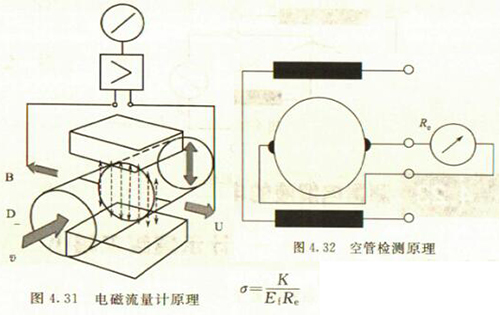 鍋爐水流量計是專為測量導電液體的體積流量而設計的。測量原理是基于法拉*電磁感應定律。按照該定律,導電流體通過磁場作切割磁力線運動時,在垂直于磁場及流速的方向上產(chǎn)生感應電動勢,此電動勢由4.14節(jié)中的式4.24)給出。其原理如圖4.31所示。