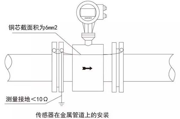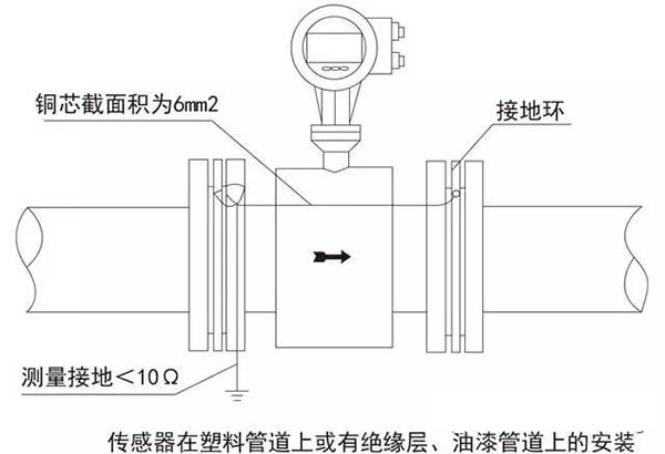 為了使儀表可靠的工作,傳感器產(chǎn)生的流量信號(hào)非常微弱,通常為微伏或毫伏級(jí)。防止外界電干擾的影響是用好流量計(jì)的一個(gè)重要因素,接地是解決電干擾影響的一個(gè)很有效的措施。因此,傳感器應(yīng)有良好的單獨(dú)接地線,接地電阻<10Ω。在連接傳感器的管道內(nèi)若涂有絕緣層或是非金屬管道時(shí),傳感器兩側(cè)還應(yīng)加裝接地環(huán)或內(nèi)置接地電*。