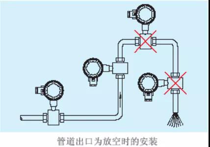 當(dāng)出口為放空狀態(tài)時(shí),傳感器不應(yīng)安裝在管道放空之處,應(yīng)安裝在較低處。傳感器安裝在管道下方處時(shí),應(yīng)保證傳感器內(nèi)被液體充滿,不能出現(xiàn)空管狀態(tài)。