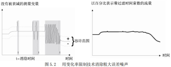 “變化率限制值”與“不敏感時(shí)間值”是用來消除某些增加阻尼不能除去的噪聲。它能夠從真實(shí)的流量信號中判別出階躍信號引起的噪聲和漿液尖狀噪聲。這種判別是以變化率的限制和持續(xù)時(shí)間為依據(jù)的。圖 5.2 所示為使用變化率限制技術(shù)去除粗大誤差的原理說明。該功能為在前面采樣中獲得的流量數(shù)據(jù)經(jīng)一階濾波后的,設(shè)定某一上限和下限(變化率)。如果當(dāng)前采樣的流量數(shù)據(jù)超過或低于這個(gè)*限值,而且在超過或低于這個(gè)*限值的變化時(shí)間之內(nèi),則認(rèn)為這種變化是由于噪聲所引起的,CPU 予以切除;而當(dāng)超過或低于這個(gè)*限值的變化在設(shè)置的不敏感時(shí)間以外,則認(rèn)為這種變化是由于真正的流量變化所引起,CPU 就認(rèn)可是測量流量的變化。