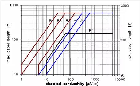以某品*原水流量計(jì)選型樣本提供的電導(dǎo)率和電纜長(zhǎng)度曲線為例,其中A型電纜為雙芯雙屏蔽DS300、B型電纜為雙芯三屏蔽BTS300。像浙江省一般水庫原水電導(dǎo)率在100us/cm左右,安裝所需電纜線小于100米,選A型即可,超過100米,需要選B型。
