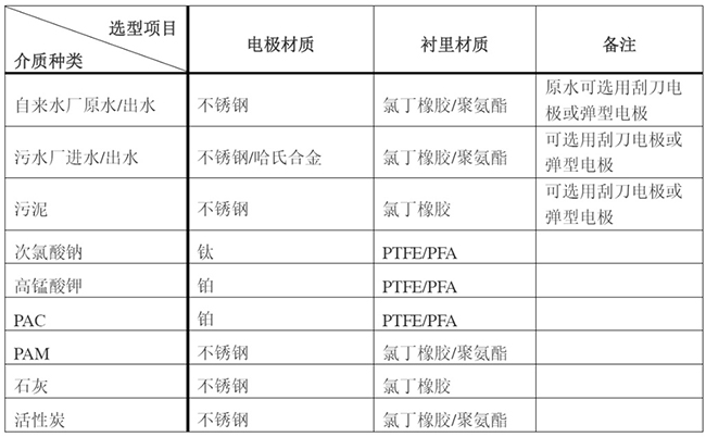 電*對(duì)被測(cè)量介質(zhì)的耐腐、抗磨蝕、無電化學(xué)反應(yīng)是選擇材質(zhì)考慮的因素。常用金屬材料有含鉬耐酸鋼、哈氏合金B(yǎng)、哈氏合金C、鈦、鉭、鉑銥合金等。由于介質(zhì)種類繁多,其腐蝕性又受溫度、濃度、流速等復(fù)雜因素影響而變化,生產(chǎn)廠僅能給出很粗略的各種電*的適用范圍。電*材質(zhì)的選擇可從使用者借鑒該介質(zhì)在其他設(shè)備的應(yīng)用實(shí)例和以往的經(jīng)驗(yàn)來確定。浙江某自來水廠用于計(jì)量5-10%次氯酸鈉投加,電*材質(zhì)選擇了哈氏合金,在運(yùn)行使用1年多的時(shí)間后,出現(xiàn)傳感器故障,返廠檢測(cè)發(fā)現(xiàn)電*腐蝕,后我司選擇鈦電*材質(zhì),現(xiàn)運(yùn)行情況良好。水行業(yè)常規(guī)選型詳見表2。