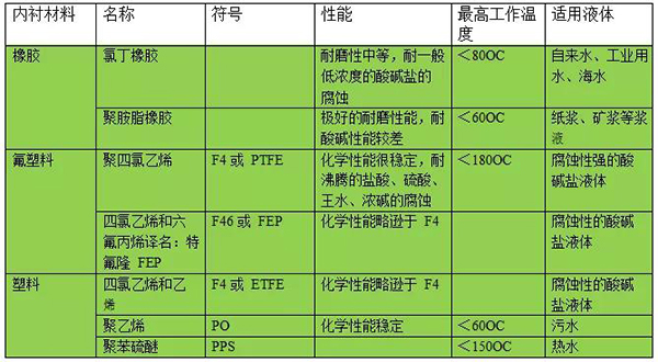 應(yīng)根據(jù)被測(cè)介質(zhì)的腐蝕性、磨損性和溫度來(lái)選擇內(nèi)襯材料。