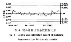 兩臺(tái)儀表中一臺(tái)日常貿(mào)易交接計(jì)量儀表由另一臺(tái)參比表(master meter)核查和校驗(yàn)。圖4所示是貿(mào)易計(jì)量儀表流量在4000~5500m³/h時(shí)的校驗(yàn)記錄,變化在原校準(zhǔn)儀表系數(shù)的±0.180%范圍內(nèi),*大變化為0.090%,標(biāo)準(zhǔn)偏差為0.045%。