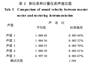 再從計(jì)量儀表與參比表五個(gè)聲道的各聲道間,求取聲速比值考察儀表的穩(wěn)定性,表2摘錄流量在5500m³/h時(shí)的聲速比,五個(gè)聲道兩儀表聲速比變化*大為0.006%。