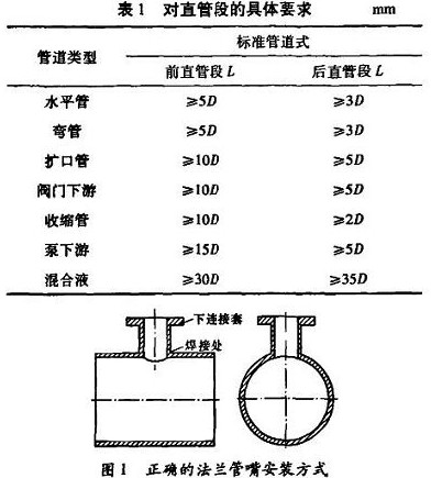 流體在方向、管徑以及閥門開度變化時,會產(chǎn)生渦流和流場畸變,這樣會對傳感器電*的測量產(chǎn)生影響,從而影響儀表的精度。所以要盡可能地離開彎管、手閥、調節(jié)閥等部件一定距離,直管段的具體要求見表1。表中,D表示管道通徑,L表示傳感器到閥門或彎頭等部件的距離。