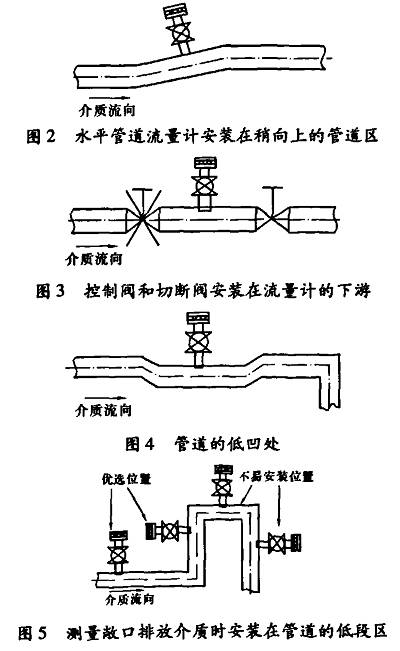 為了保障測量精度,傳感器應避免在容易產(chǎn)生真空、氣體、渦流等地方安裝,傳感器與智能變送器之間的通訊電纜要避開電動機等強電設備。建議安裝在圖2~圖5所示位置。