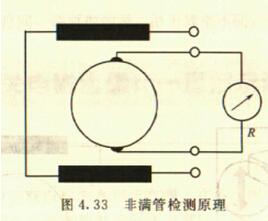 非滿管檢測(cè)也是基于電導(dǎo)率檢側(cè)的方法。在圖4.33所示的電磁流量傳感器中,增加了一個(gè)(或一對(duì))非滿管檢測(cè)電*。當(dāng)導(dǎo)管內(nèi)液體滿管時(shí),頂部電*與其他電*之間的電阻值很?。欢?dāng)存在非滿管情況時(shí),頂部電*與導(dǎo)電液體之間有氣體阻隔,所以電*電阻顯著增大,從而做出非滿管判斷。