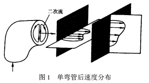 流體流過(guò)彎管由于離心力作用,靠外壁產(chǎn)生擴(kuò)散效應(yīng),內(nèi)壁產(chǎn)生收縮效應(yīng),由此產(chǎn)生橫向流動(dòng)的二次流,引起下游產(chǎn)生速度分布畸變,如圖1所示。圖1中,右邊垂直剖面彎管外緣流速較快,水平剖面呈雙峰值流速分布。隨著液流離開(kāi)彎管距離增加.畸變會(huì)趨于緩和。