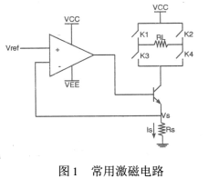 以往的激磁電路的設(shè)計(jì)都是采用恒流源和可控開關(guān)電路組成。恒流源是由電壓基準(zhǔn)、比較放大、控制調(diào)整和采樣等部分組成的直流負(fù)反饋?zhàn)詣?dòng)調(diào)節(jié)系統(tǒng),常用的激磁電路就是用串聯(lián)調(diào)整型恒流電源盒控制開關(guān)組成的,如圖1。其中Vref是參考電壓,Rs是采樣電阻,Is為流過Rs的電流,就是所需的恒流,RL為電磁流量傳感器線圈,K1、K2、K3、K4為可控開關(guān),以達(dá)到使線圈RL中流經(jīng)正負(fù)交換的電流,對傳感器激磁。