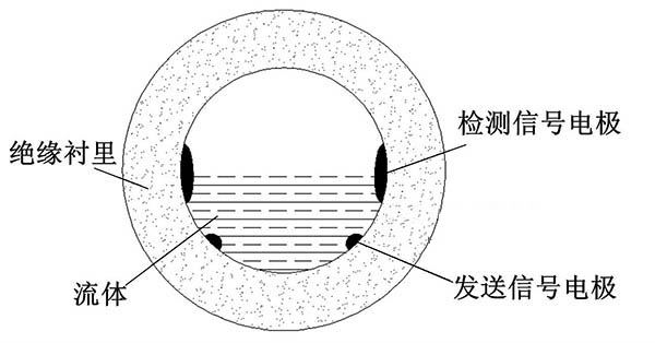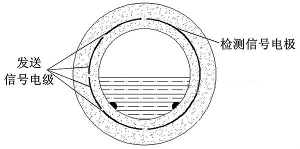 ③利用阻抗或信號(hào)衰減研制的非滿管水處理流量計(jì)。這種結(jié)構(gòu)的非滿管水處理流量計(jì)是當(dāng)前國(guó)內(nèi)研究的方向之一。其結(jié)構(gòu)是流量管底部貼一對(duì)信號(hào)發(fā)射電*,在流量管中間貼信號(hào)接收電*。由于信號(hào)在流體中傳播會(huì)產(chǎn)生衰減,且傳播時(shí)間越長(zhǎng),衰減越多,因此通過信號(hào)接收電*接收到的信號(hào)衰減量即可得知液面高度;同時(shí)該電*還能測(cè)量流體切割磁感線產(chǎn)生的電動(dòng)勢(shì),以此達(dá)到測(cè)量非滿管流量的目的。阻抗式或信號(hào)衰減非滿管水處理流量計(jì)結(jié)構(gòu)簡(jiǎn)圖如圖5所示。